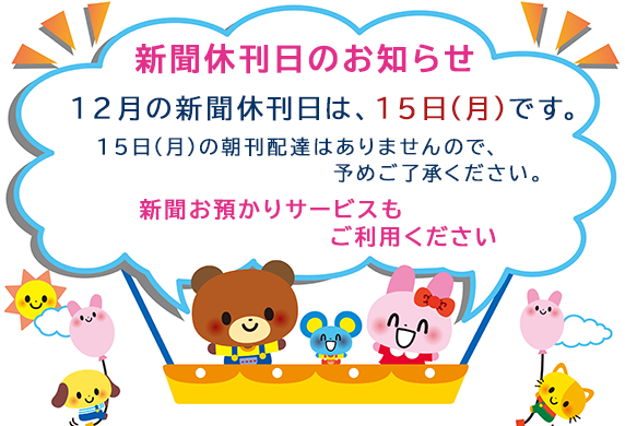 12月の新聞休刊日は、15日(月)です。年末年始の配達については、後日お知らせいたします。