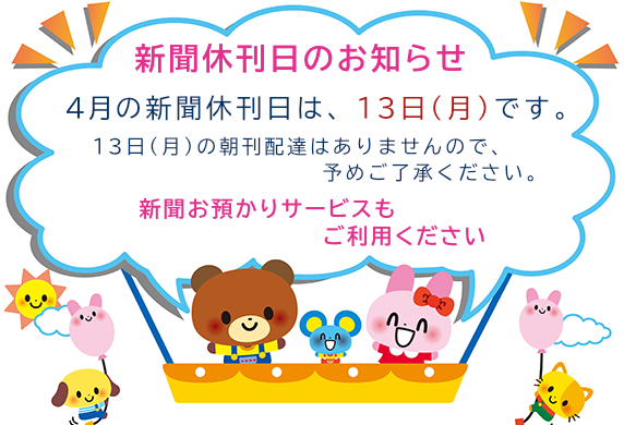 4月の新聞休刊日は、13日(月)です。ご利用ください 新聞お預かりサービス